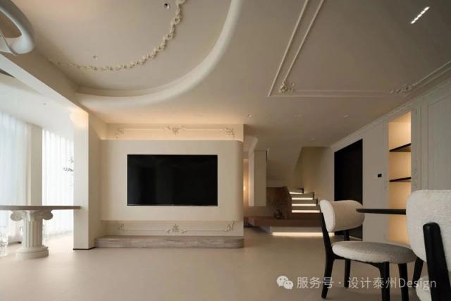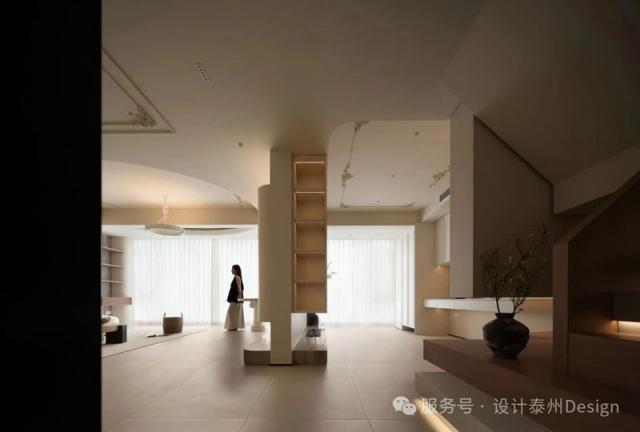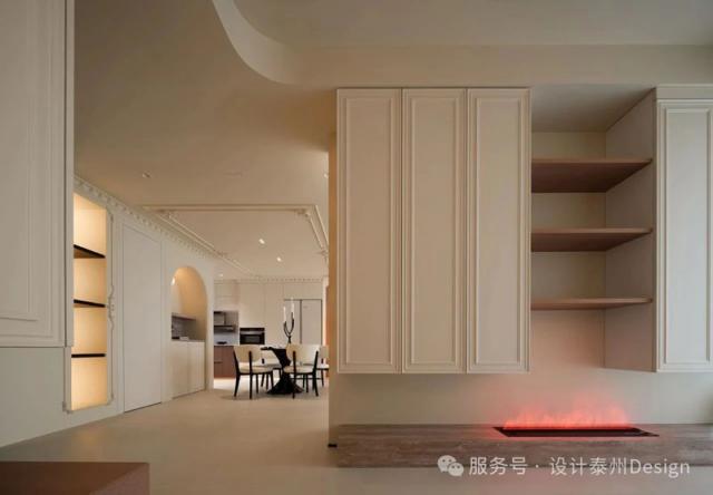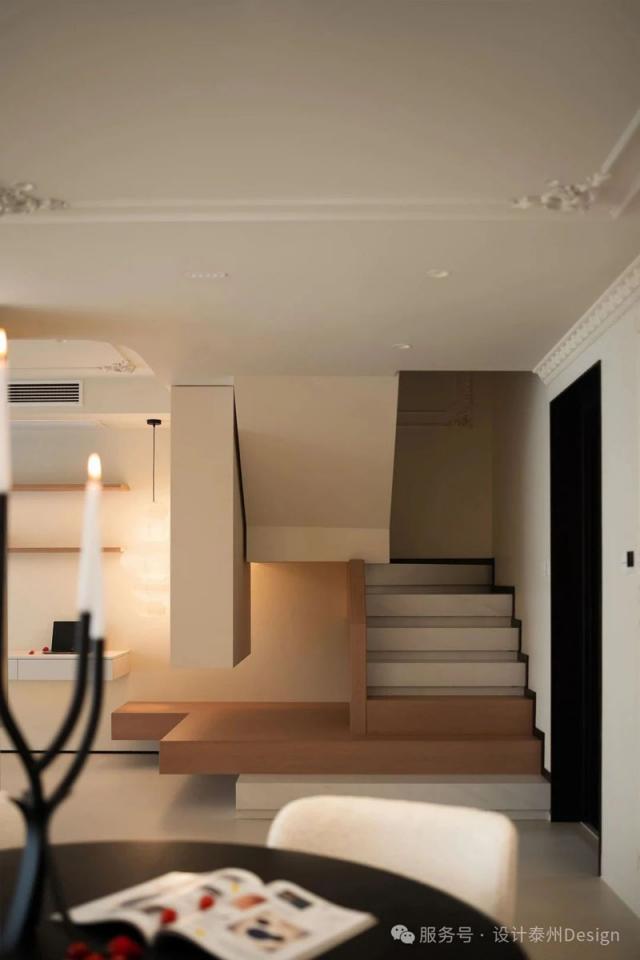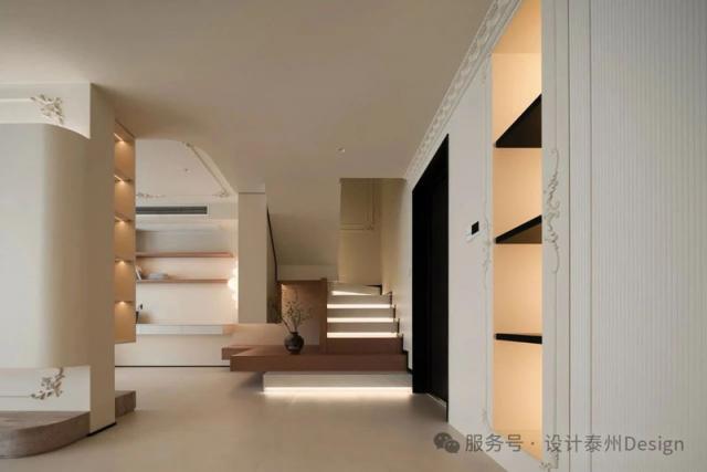 樓梯以懸浮感、燈帶勾勒輪廓,木質(zhì)踏步與淺色基座融合,弧形線(xiàn)條延續(xù)空間語(yǔ)言。樓梯旁開(kāi)放格、展示架與墻面雕花呼應(yīng),成為空間過(guò)渡的裝飾節(jié)點(diǎn),讓上下樓層的移動(dòng),從功能性行為變?yōu)榇┧笥谒囆g(shù)場(chǎng)景的體驗(yàn)。