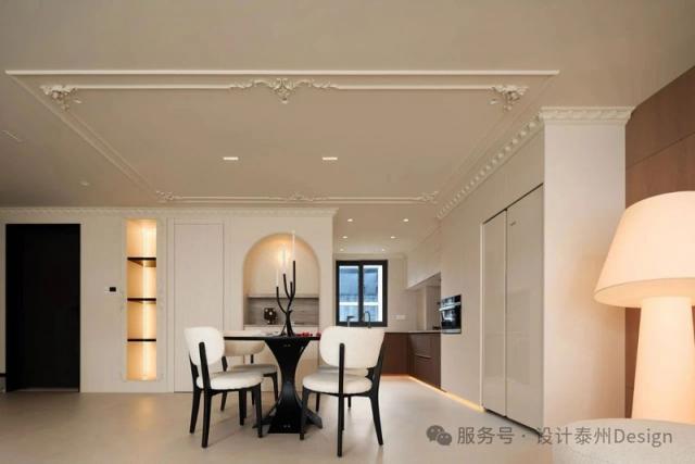 設(shè)計(jì)師用淺木色地板統(tǒng)一空間,搭配精致的石膏線(xiàn)雕花,在簡(jiǎn)約中藏匿著令人驚喜的細(xì)節(jié)。當(dāng)夜幕降臨,層次分明的燈光漸次亮起,整個(gè)空間便沉浸在一片溫馨的光暈中。