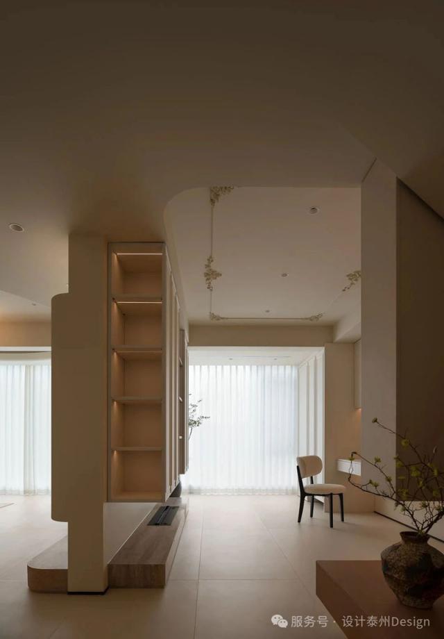過(guò)渡區(qū)的開(kāi)放收納、展示空間,可陳列藏品、綠植,延續(xù)空間敘事。光影在此交織,人行走其間步移景異,串聯(lián)起不同功能區(qū),也串聯(lián)起生活的起承轉(zhuǎn)合,演繹空間哲學(xué)的具象表達(dá)。