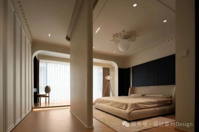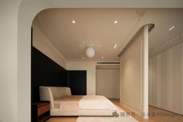 臥室以弧形拱門(mén)、立柱劃分區(qū)域,構(gòu)建半開(kāi)放的休憩與休閑子空間,既保證私密性,又增添空間層次。定制柜體沿墻排布,滿(mǎn)足收納需求,與整體風(fēng)格統(tǒng)一,營(yíng)造簡(jiǎn)潔有序的睡眠環(huán)境。